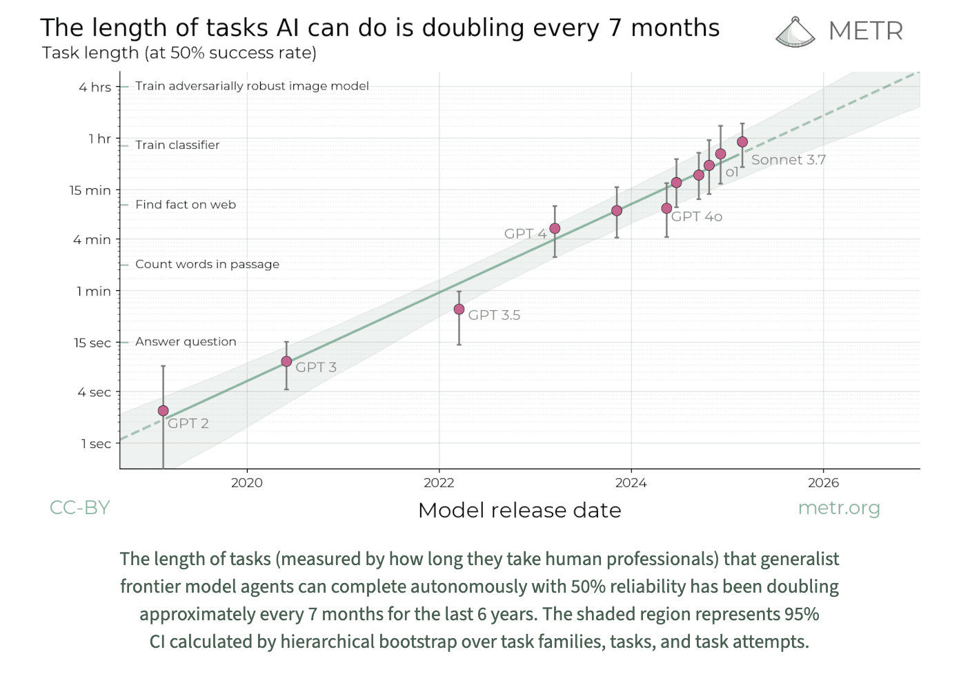 Wenn die Studien recht haben, könnten KI-Modelle bis Ende dieser Dekade Aufgaben übernehmen, für die wir Menschen eine ganze Woche brauchen. Eine. Ganze. Woche.