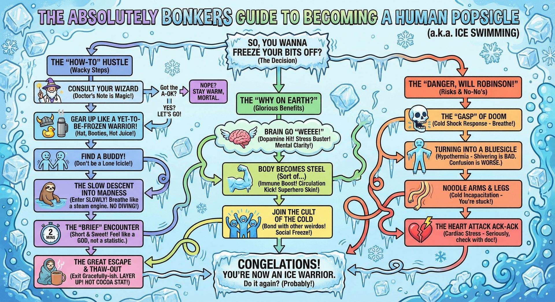 Und weil es mal wieder gefühlt 1000 KI Updates gab, wie z.B. Nano Banana Pro, hier noch ein paar wunderbar absurde Flowcharts für euch (Achtung, Rabbit Hole!). Die KI baut nicht nur einen kohärenten roten Faden durch den Wahnsinn, der Text ist lesbar UND teilweise sogar witzig.